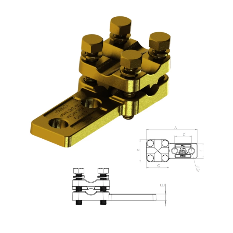 Conexão por aperto para terminação barramento-cabo. Indicado para cabos de cobre. Opções na sapata com dois ou quatro furos padrão nema.