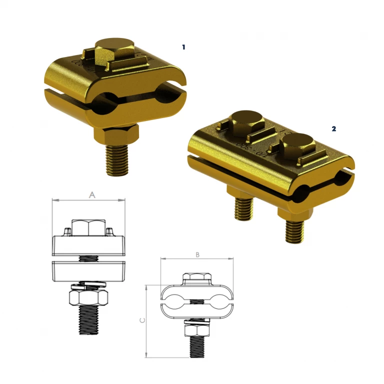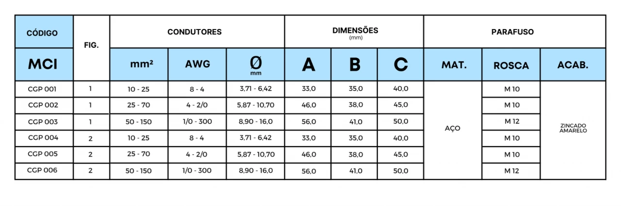 Fabricado em liga de cobre de alta condutividade elétrica e resistência mecânica, parafuso, porca e arruela lisa e pressão em aço zincado eletrolítico e bicromatizado.