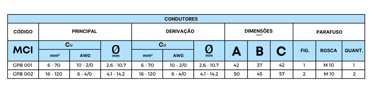 Fabricado em liga de cobre de alta condutividade elétrica e resistência mecânica, parafuso, porca e arruela de pressão em aço zincado eletrolítico e bicromatizado.