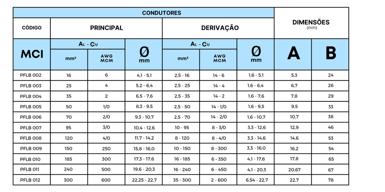 Conexão por aperto, derivação ou emenda (tração reduzida). Para cabos de cobre ou alumínio. Indicado para conexões cobre-cobre, cobre-alumínio, alumínio-alumínio.