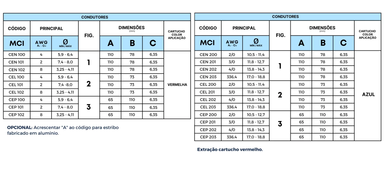 Estribo fabricado em liga de cobre e conector em liga de alumínio de alta condutividade elétrica e resistência mecânica, fornecido com composto anti-óxido.