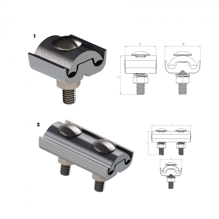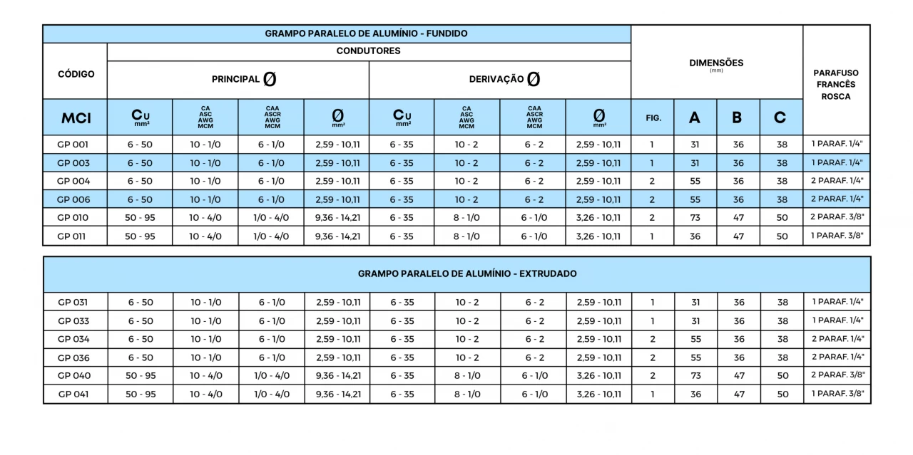 Conexão por aperto entre cabo-cabo. Indicado para conexões paralelas cobre-alumínio, alumínio-alumínio.
