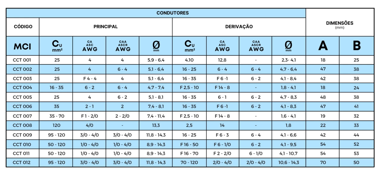 Conexão por aperto derivando cabos de cobre ou alumínio CA, CAA. Indicado para conexões cobre-alumínio, alumínio-alumínio.