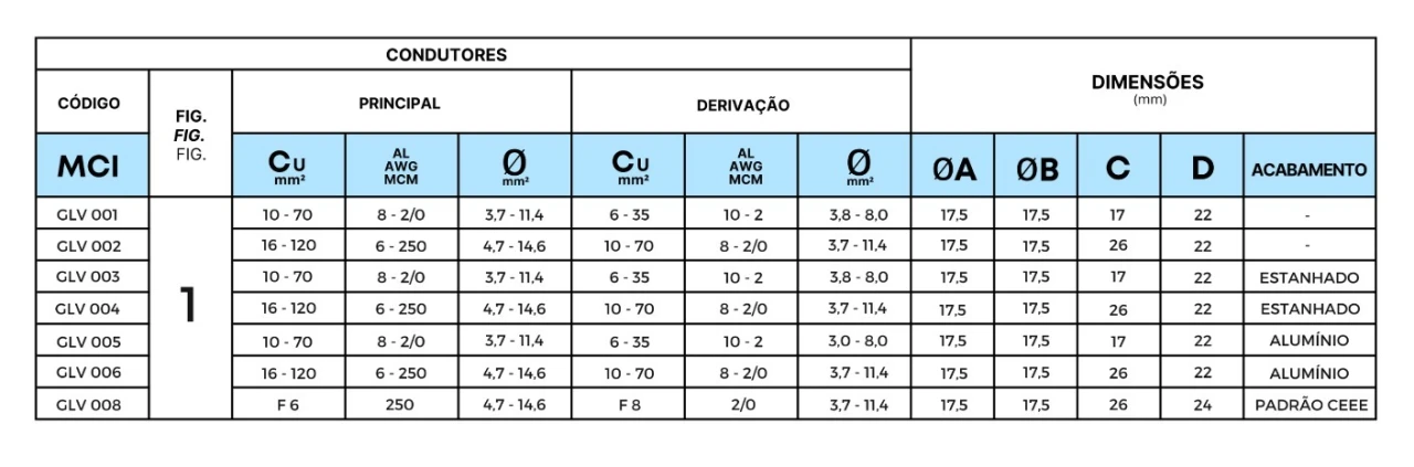 Corpo e componentes fabricados em liga de cobre ou alumínio de alta condutividade elétrica e resistência mecânica. Porca e arruela de pressão em bronze silício, alumínio ou aço zincado eletrolítico e bicromatizado.