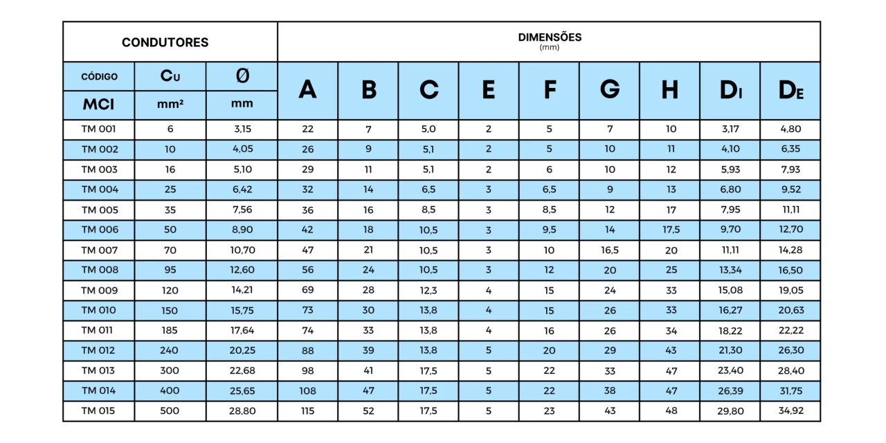 Conexão por aperto para terminações barramento-cabo. Indicado para cabos de cobre, podendo ser inseridos a 180º ou 94º em relação ao barramento.